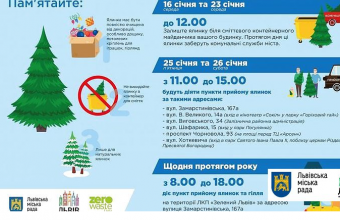 Про це повідомили у вівторок, 15 січня, в прес-службі Львівської міськради, де також розповіли: «Досить зняти з ялинки всі новорічні прикраси й винести її до контейнерного майданчика поруч із будинком в середу, 16 січня, зранку (до 12.00) або 23 січня. Впродовж дня ці ялинки заберуть комунальні служби міста й завезуть на переробку в «Зелений Львів».