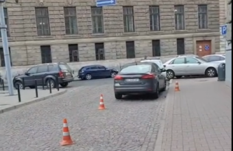 Поліція у Львові порушує правила дорожнього руху. Вона виставляє конуси на проїзній частині перед приміщенням ГУ Національної поліції у Львівській області на площі Григоренка у Львові.