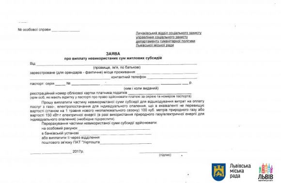 Начальник управління соціального захисту Львівської міської ради Наталія Демкович розповіла: «Ті сім’ї, які мали економію субсидії по електроенергії або газу, які використовуються для індивідуального опалення, їм така переплата, така економія енергоносіїв, монетизується. Для цього вони мають до 31 серпня включно звернутися до відділу соціального захисту і написати заяву, де вказати спосіб отримання цих коштів – або на банківський рахунок, або на поштове відділення. Відділи розробили типовий бланк заяви (див – у прикріпленні – авт.). Заява може бути довільної форми, але у ній мають бути вказані всі необхідні дані, бо якщо їх не буде, то ми не зможемо перерахувати гроші».
