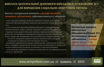 На початку року Міністерство оборони України видало наказ №30 від 31.01.2022 «Про бюджетну політику Міністерства оборони України на 2022 рік». Поряд з іншими виплатами для армійців передбачили і грошові кошти для виплати матеріальної допомоги для розв’язання соціально-побутових питань в розмірі одного окладу за їхніми військовими званнями.