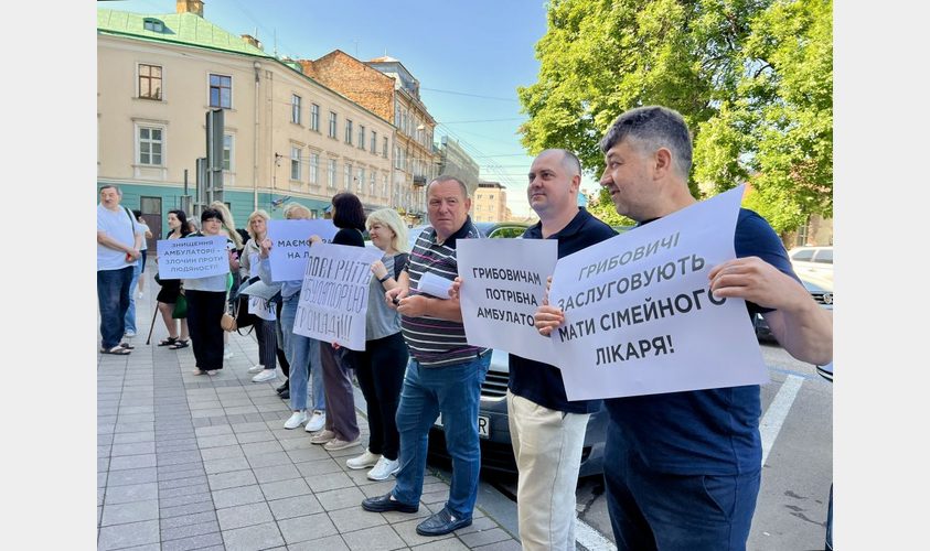 Мешканці села Великі Грибовичі зібрались з пікетом біля Львівської обласної ради, де сьогодні під час сесійного засідання мали б розглядати питання передання будівлі амбулаторії обласному Центру екстреної медичної допомоги. Громада села проти такого рішення, адже хоче, щоб тут нарешті відкрилась запланована амбулаторія сімейної медицини.