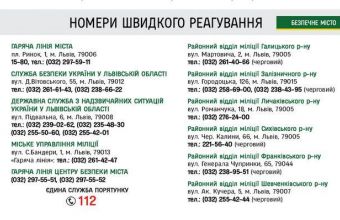 Є телефон міліції – 102, телефон Служби безпеки – 261-61-43, телефон Центру безпеки міста – 297-55-51, 297-55-52, а також Гаряча лінія міста – 15-80. Львів’яни можуть телефонувати на лінію Центру безпеки міста, зголошуватись до патрулювання міста. Дзвінки приймаються, оператор їх опрацьовує і, відповідно, знає куди скерувати звернення».