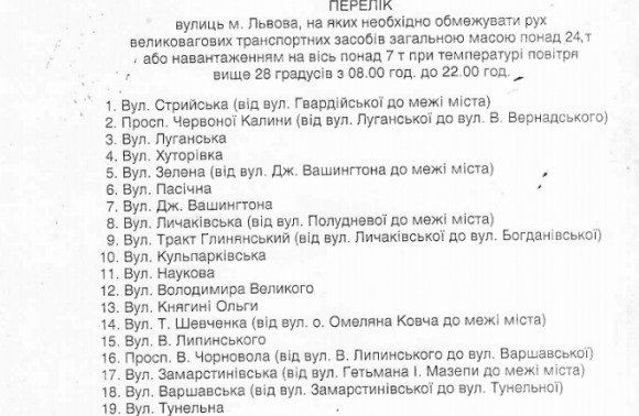 У ЛМР запевнили: «Міський голова Львова підписав сьогодні розпорядження «Про затвердження переліку вулиць, на яких буде обмежено рух великовагових транспортних засобів при температурі повітря вище 28 градусів».