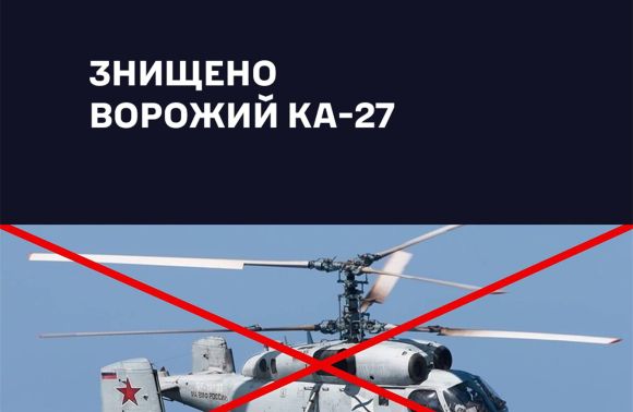 Силами та засобами Військово-Морських Сил Збройних Сил України над акваторією Чорного моря знищено ворожий корабельний протичовновий вертоліт Ка-27.