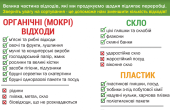 «Також, як повідомили у департаменті з питань поводження з твердих побутових відходів, у Львові впроваджують систему сортування відходів. Відтепер сортування передбачатиме чотири категорії: органічні відходи; змішані відходи; пластик; скло. Незабаром на контейнерах міста з’являться перші наліпки, що маркуватимуть їх призначення. Як повідомив директор департаменту з питань поводження з твердими побутовими відходами Іван Рудницький, органічні відходи вивозитимуть на захоронення на полігон, змішані відходи планують спресовувати. Скляні та пластикові відходи відправлятимуть на переробку», – поінформували також сьогодні, 20 червня, в прес-службі Львівської міськради.