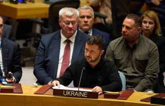 за спиною президента Володимира Зеленського сидять міністр МЗС Андрій Сибіга (зліва) і керівник офісу президента Андрій Єрмак