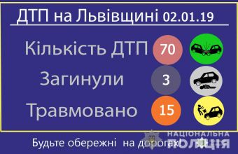 Зокрема, у Львові зареєстрували минулої доби 39 дорожньо-транспортних пригод. 2 січня внаслідок ДТП на автодорогах Львівської області загинули минулої доби троє людей, а п’ятнадцятеро були травмовані.