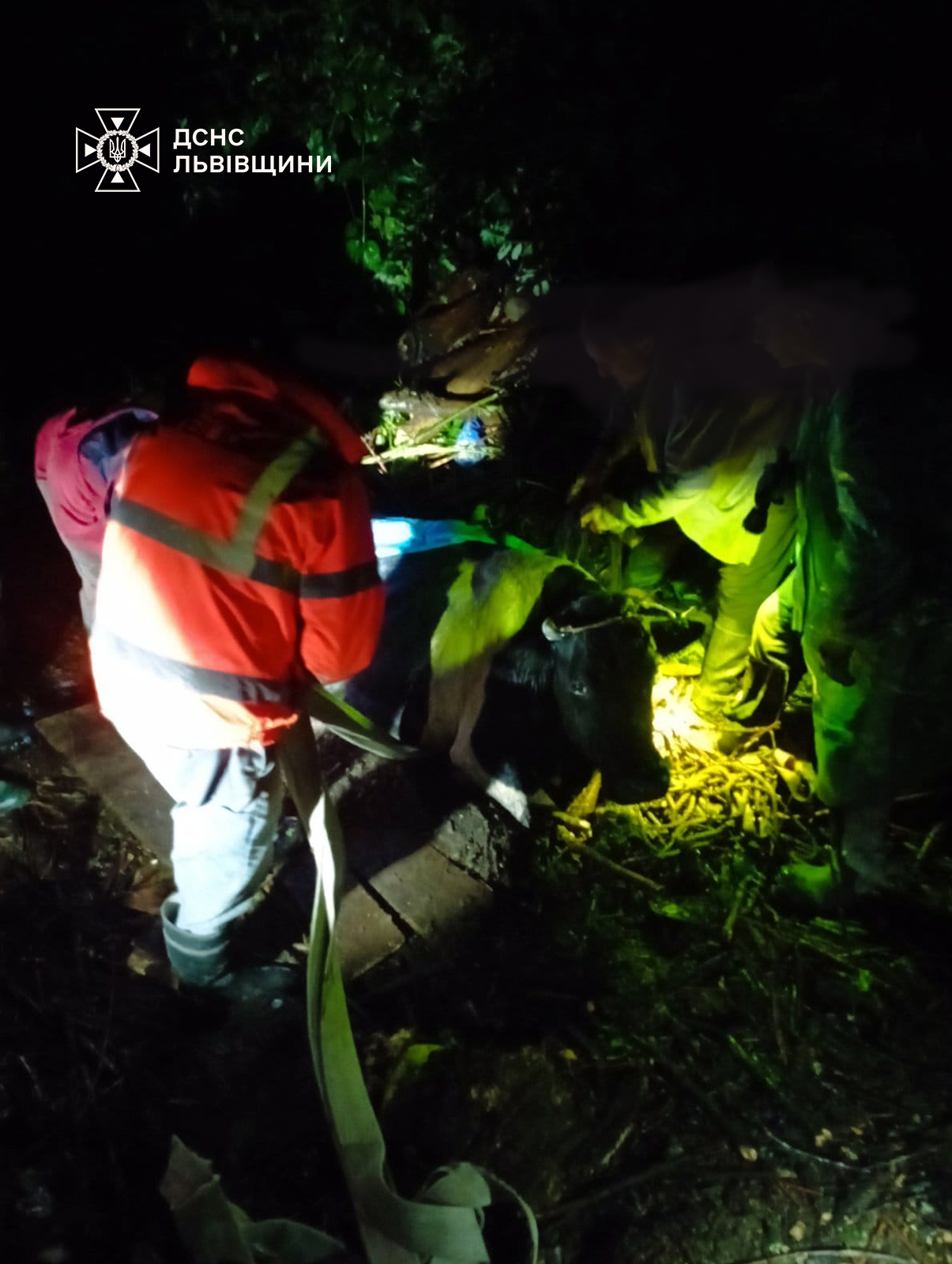 На місце прибули рятувальники м. Борислава та місцеві мешканці. Спільними зусиллями, за допомогою пожежних рукавів і трактора, підняли тварину з ями.