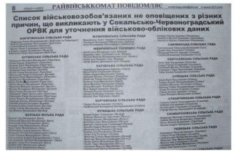 Зокрема, за ініціативою Сокальсько-Червоноградського об’єднаного районного військового комісаріату у районних газетах надрукували список військовозобов’язаних, які з різних причин упродовж мобілізаційної кампанії не були оповіщені. В опублікованому матеріалі наголосили, що ці особи мають терміново з’явитись до військкомату для уточнення військово-облікових даних.