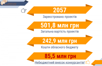 В облраді запевнили: «Цьогоріч на участь у конкурсі проектів місцевого розвитку зареєстрували рекордну кількість заявок – 2057 на загальну вартість 501,8 млн. гривень, з яких 242,9 млн. гривень – це кошти з обласного бюджету та 85,5 млн. гривень – небюджетний внесок конкурсантів».