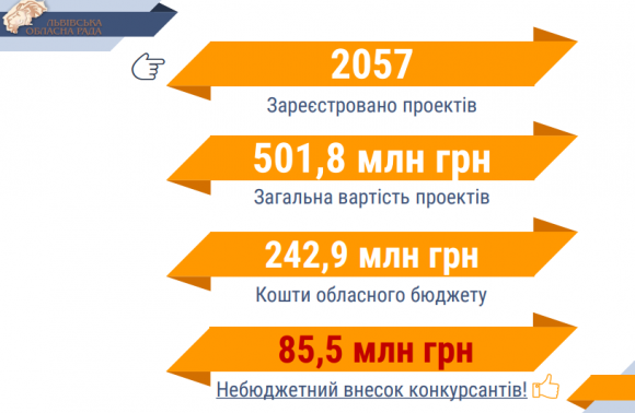 В облраді запевнили: «Цьогоріч на участь у конкурсі проектів місцевого розвитку зареєстрували рекордну кількість заявок – 2057 на загальну вартість 501,8 млн. гривень, з яких 242,9 млн. гривень – це кошти з обласного бюджету та 85,5 млн. гривень – небюджетний внесок конкурсантів».