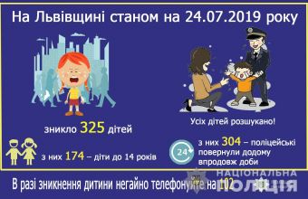 Про це повідомили в середу, 24 липня, в прес-службі Головного управління поліції у Львівській області, де також розповіли: «Працівники поліції з’ясували місцезнаходження усіх дітей. у 304 випадках це сталося впродовж доби».