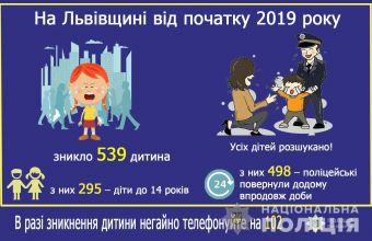 2019 року до працівників поліції у Львівській області надійшло 539 повідомлень про безвісне зникнення дітей, у тому числі 295 малолітніх.