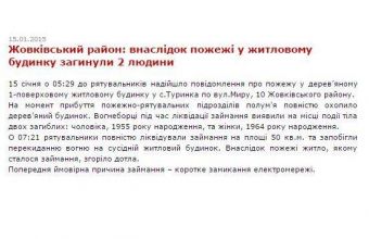 «15 січня о 05:29 до рятувальників надійшло повідомлення про пожежу в дерев’яному одноповерховому житловому будинку на вулиці Миру, 10 в селі Туринка Жовківського району. На момент прибуття пожежно-рятувальних підрозділів полум’я повністю охопило дерев’яний будинок. Вогнеборці під час ліквідації займання виявили на місці події тіла двох загиблих: чоловіка, 1955 року народження, та жінки, 1964 року народження.