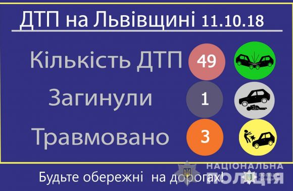 Про це повідомили в п’ятницю, 12 жовтня, в прес-службі Головного управління поліції у Львівській області, де також розповіли: «Внаслідок ДТП загинув пішохід, тілесні ушкодження отримали ще троє пішоходів. За наслідками інших ДТП складено 45 адміністративних протоколів за статтею 124 (порушення правил дорожнього руху, що спричинило пошкодження транспортних засобів, вантажу, автомобільних доріг, вулиць, залізничних переїздів, дорожніх споруд чи іншого майна) Кодексу України про адміністративні правопорушення, яка передбачає накладення штрафу в розмірі двадцяти неоподатковуваних мінімумів доходів громадян або позбавлення права керування транспортними засобами на строк від шести місяців до одного року».