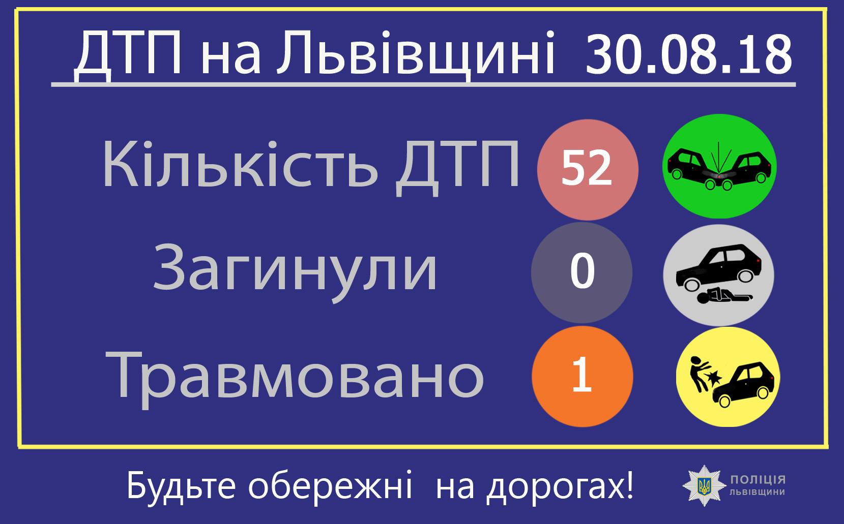Про це повідомили в п’ятницю, 31 серпня, в прес-службі Головного управління поліції у Львівській області, де також розповіли: «В одній із ДТП тілесні ушкодження отримав пішохід. За наслідками інших ДТП складено 51 адміністративний протокол за статтею 124 (порушення правил дорожнього руху, що спричинило пошкодження транспортних засобів, вантажу, автомобільних доріг, вулиць, залізничних переїздів, дорожніх споруд чи іншого майна) Кодексу України про адміністративні правопорушення, яка передбачає накладення штрафу в розмірі двадцяти неоподатковуваних мінімумів доходів громадян або позбавлення права керування транспортними засобами на строк від шести місяців до одного року».