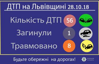 Про це повідомили в понеділок, 29 жовтня, в прес-службі Головного управління поліції у Львівській області, де також розповіли: «Загалом сталося 56 дорожньо-транспортних пригод, п'ять із яких – із потерпілими».
