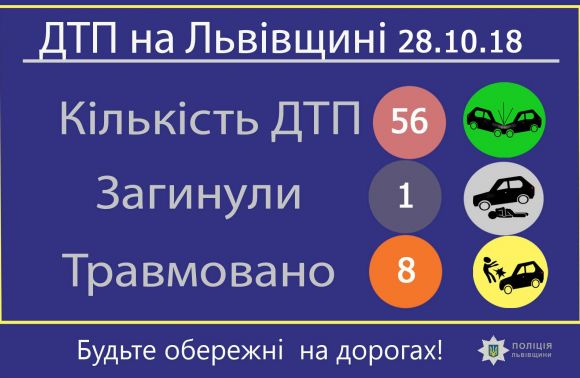 Про це повідомили в понеділок, 29 жовтня, в прес-службі Головного управління поліції у Львівській області, де також розповіли: «Загалом сталося 56 дорожньо-транспортних пригод, п'ять із яких – із потерпілими».