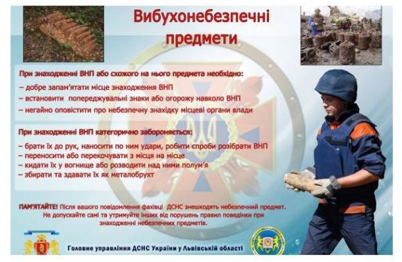 Львівське обласне управління ДСНС України закликає мешканців у жодному разі не торкатися підозрілих знахідок. Вони можуть вибухнути, що призведе до Вашого травмування. У разі виявлення боєприпасу чи іншого підозрілого предмету негайно телефонуйте до Служби порятунку за номером 101!».