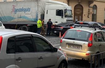 На пл. Соборній - зіткнення вантажівки з легковиком. Тимчасово не курсують трамваї