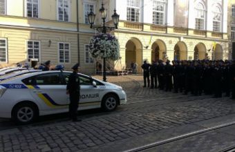 400 працівників нової поліції після складання присяги приступлять до патрулювання Львова. За урочистою церемонією спостерігають кілька сотень львів'ян, які прийшли на площу Ринок з державними прапорами України.
