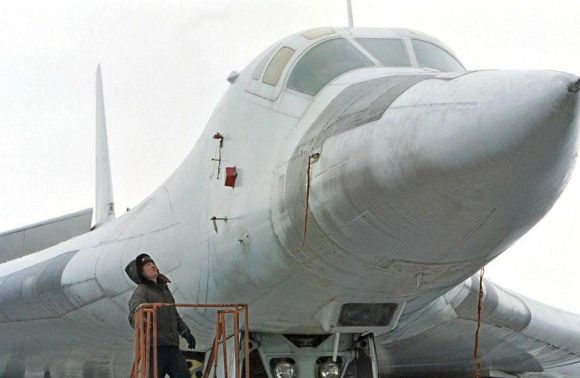 Авіатехнік закінчує перевірку останнього важкого бомбардувальника Ту-160 перед його вильотом до Росії на військовому аеродромі в Прилуках, у Чернігівській області, Україна, 21 лютого 2000 року