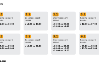 Група 1.1. Електроенергії немає з 02:00 до 05:30, з 12:30 до 16:30.