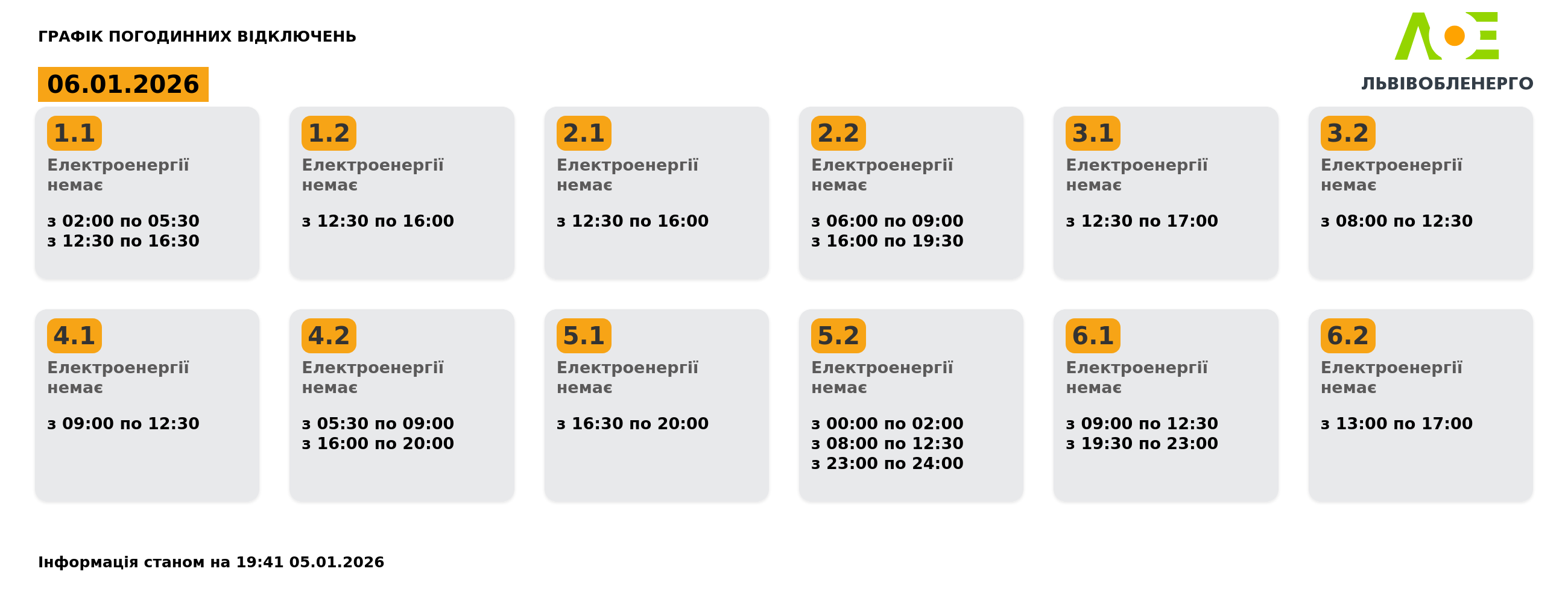 Графік погодинних відключень на 06.01.2026 станом на 19:41 05.01.2026