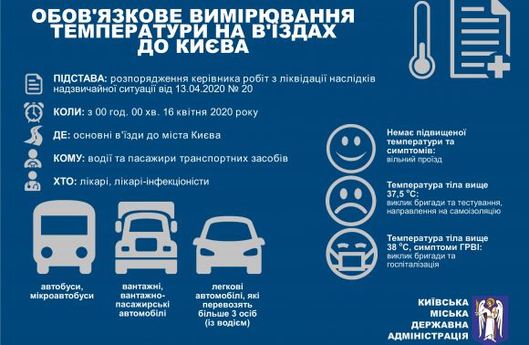 "Від завтра, з 16 квітня, водіям та пасажирам транспорту на основних в’їздах до Києва обов’язково вимірюватимуть температуру... Перевірятимуть автобуси та мікроавтобуси, вантажні та вантажно-пасажирські автомобілі", — йдеться в повідомленні.