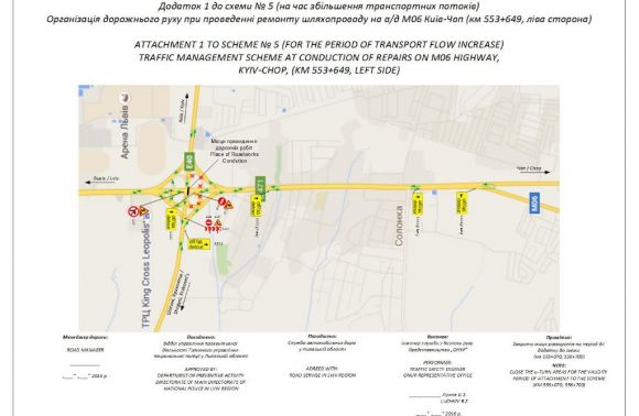 Рух автотранспорту напрямку: Львів (вулиця Стрийська) – Київ та напрямку Краковець, Шегині (західний обхід Львова) – Київ здійснюватиметься через село Солонка з розворотом перед снлом Ков’ярі та подальшим правоповоротним з’їздом перед АЗС «WOG», мотель «Катерина», стадіон «Арена-Львів». Рух автотранспорту напрямків Київ – Чоп та Чоп – Київ здійснюватиметься за існуючою схемою організації дорожнього руху. Ремонтні роботи триватимуть орієнтовно 30 днів.