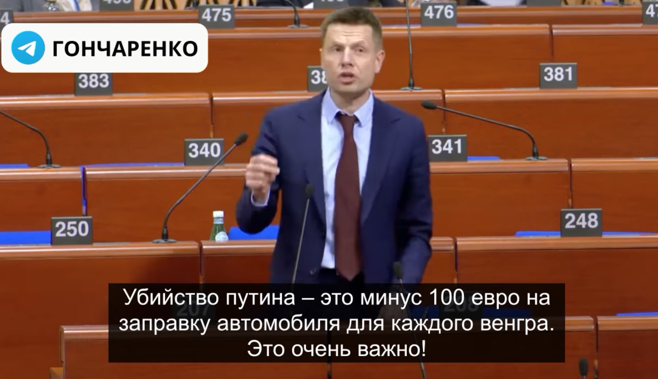 Делегат від України у Парламентській асамблеї Ради Європи Олексій Гончаренко сказав у своєму виступі в ПАРЄ: "Ми у пошуках інвестицій у світі. Найкраща інвестиція у світі – вбити Путіна.