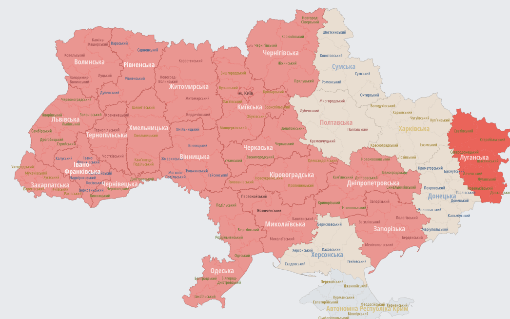 Повітряну тривогу оголошено у більшості областей України.