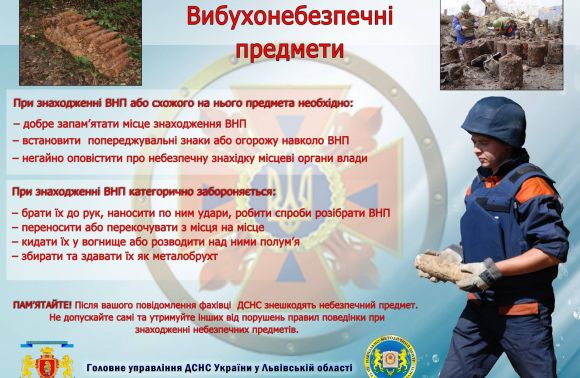 Головне управління ДСНС України у Львівській області застерігає мешканців у жодному разі не рухати підозрілі знахідки. Вони можуть вибухнути, що призведе до Вашого травмування. У разі виявлення боєприпасу чи іншого підозрілого предмету негайно телефонуйте до Служби порятунку за номером 101!».