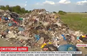 «Сім машин Львівського сміття вивантажили невідомі на Рівненщині. Між селами Кам'янка та Антонівка. Про походження вантажу, кажуть місцеві жителі, свідчать товарні чеки, знайдені серед непотребу. Люди обурені, що відходи на санкціоноване звалище тепер мають перевозити коштом сільради», – повідомила сьогодні, 24 травня, «Телевізійна служба новин» каналу «1+1». Подробиці – в її відеосюжеті: