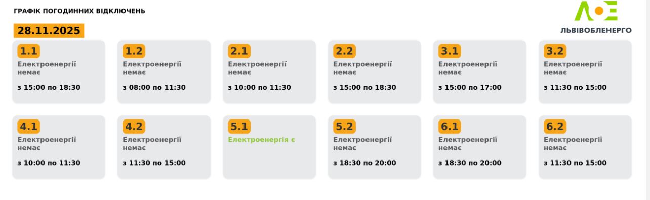 Про це повідомило ПрАТ «Львівобленерго», пише DailyLviv.com. Тільки одна підгрупа споживачів - 5.1 - буде мати електропостачання без обмежень.
