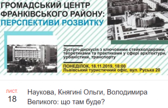 У понеділок, 18 листопада, о 18.00 у приміщенні управління туризму на вулиці Руській (№20) розпочнеться публічне обговорення з ключовими стейкхолдерами, теоретиками та практиками у сфері архітектури, урбаністики та транспорту щодо перспективного розвитку Франківського району.
