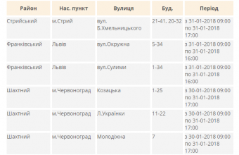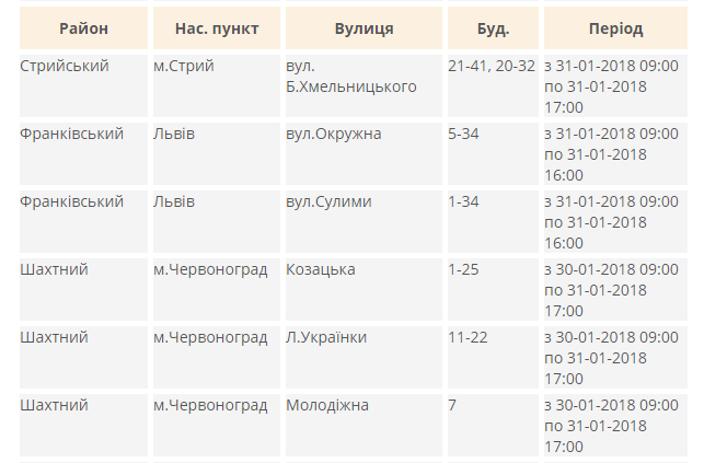 Зокрема, у Франківському районі Львова обленерго знеструмило в середу, 31 січня, до 16:00 будинки №№5-34 на вулиці Окружній і №№1-34 на вулиці Сулими. Натомість у Личаківському районі Львова до 16:49 – вулицю Крип’якевича. Про це повідомили в прес-службі «Львівобленерго».