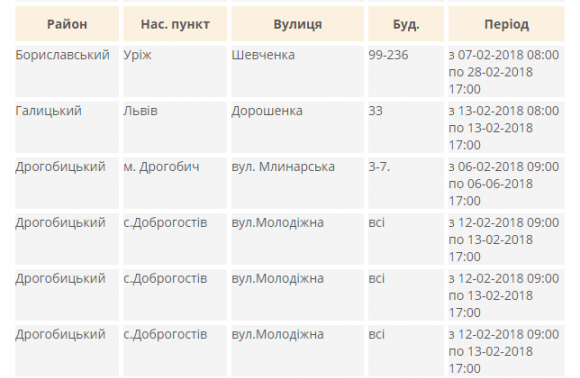 Зокрема, в Галицькому районі Львова обленерго знеструмило у вівторок, 13 лютого, до 17:00 будинки №9, №11, №14, №18 та №№23-33 на вулиці Валовій, №33 на вулиці Дорошенка, №7 на площі Галицькій, №1, №2, №2а та №3 на площі Соборній і №13 та №15 на вулиці Сербській, у Личаківському районі Львова – вулицю Збаразьку й будинки №№92-100 (непарні), №121 та №137 на вулиці Личаківській, у Франківському районі Львова – вулиці Айвазовського, Веделя й Жемчужникова та будинки №№38-40 на вулиці Кобилиці й №№46-50 на вулиці Музики, у Шевченківському районі Львова – вулиці Окуневського, Пожежників і Сосюри, в Білогорщі – всі вулиці, а в Брюховичах – вулиці Арктичну, Бурштинову, Бічну Бурштинову, Долинну, Заможну, Кліматичну, Незалежності України, Підлісну, Приколійну, Прилуцьку, Проліскову, Ряснянську, Селищну, Тиху, Івасюка, Шкільну, Ягідну та Янівську й Листяний та Ряснянський проїзди. Про це повідомили в прес-службі «Львівобленерго».