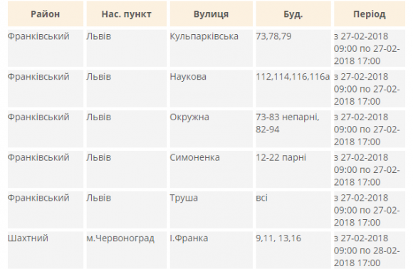 Зокрема, в Личаківському районі Львова обленерго знеструмило сьогодні, 27 лютого, до 17:00 будинки №№71-127 та №№128-160 на вулиці Старознесенській, у Сихівському районі Львова – проспект Червоної Калини й вулиці Бережанську, Гостинну, Колійну, Колодзінського, Рахівську й Рожеву, у Франківському районі Львова – вулиці Сокільницьку та Труша Меблярську й будинки №64 на вулиці Гіпсовій, №73, №78 та №79 на вулиці Кульпарківській, №228, №230 та №234а на вулиці Стрийській, №112, №114, №116 та №116а на вулиці Науковій, №№73-83 (непарні) й №№82-94 на вулиці Окружній і №№12-22 (парні) на вулиці Симоненка, у Шевченківському районі Львова – вулицю Пожежників і будинки №8 на вулиці Окуневського й №№17-46 на вулиці Сосюри, у Винниках – вулиці Батька Сокола, Довганика, Котляревського й Смерекову. Про це повідомили в прес-службі «Львівобленерго».