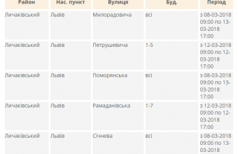 У Личаківському районі Львова обленерго знеструмило до 17:00 вулиці Галузі, Дріжджову, Зборівську, Козика, Колумба, Милорадовича, Поморянську, Січневу, Павлика й Павлова, а також будинки №№1-5 на вулиці Голинського, №20 та №№19-27 на вулиці Зеленій, №№177-223 та №№150-162 на вулиці Личаківській, №№1-5 на площі Петрушевича, №№1-7 на вулиці Рамаданівській, №№1-16 на вулиці Тракт Глинянський, №№1-5 на вулиці Ялівець, №7 та №9 на вулиці Кониського, №6 та №8 на вулиці Тершаківців і №8а, №9, №17а та №19 на вулиці Дорога Кривчицька