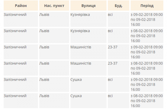 У Сихівському районі Львова обленерго знеструмило в четвер, 8 лютого, до 17:00 для безпечного проведення ремонтних робіт вулиці Бережанську, Гостинну, Колійну, Колодзінського, Рахівську й Рожеву та проспект Червоної Калини. Натомість у Франківському районі Львова до 17:00 – вулиці Воля, Гайворовського Квітневу, Кишинівську, Маковея, Рудницького, Сімовича й Цегельської, а також будинки №5 на вулиці Ганни Барвінок, №№72-94 (парні), №№61-65, №№75-79 (непарні) й №№136-160 на вулиці Генерала Чупринки, №№2-16 та №№ 1-11а на вулиці Молдавській, №№33-57, №№7а та №38 на вулиці Холодноярській, №20 та №22 на вулиці Мельника й №2 на вулиці Моршинській, а в Брюховичах до 17:00 – вулицю Круту й будинки №№ №№1-20 на вулиці Львівській і №№28-69 на вулиці Ясній.