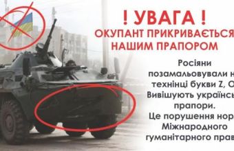 Наприклад, щоб ввести в оману агресор використовує використовує державну символіку України. Українські прапори вивішують на колонах російської військової техніки. Такі випадки трапились у населені пункти: Перемога, Нова Басань Київської області, на автодорозі Красностав – Ніжин Чернігівської області.