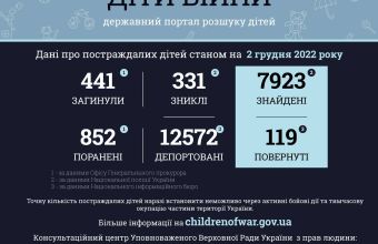 Станом на ранок 2 грудня 2022 року більше ніж 1293 дитини постраждали в Україні внаслідок повномасштабної збройної агресії Російської Федерації. За офіційною інформацією ювенальних прокурорів 441 дитина загинула та понад 852 отримали поранення різного ступеню тяжкості.