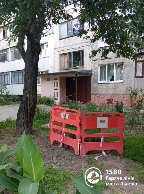 "Ділянку огороджено. Буде проведено спільне обстеження зі залученням відповідних служб та голови ОСББ щодо встановлення причини просідання ґрунту біля під’їзду 2 будинку 46 по вул. Науковій. Про подальше розв'язання питання буде повідомлено до 18.08.25".