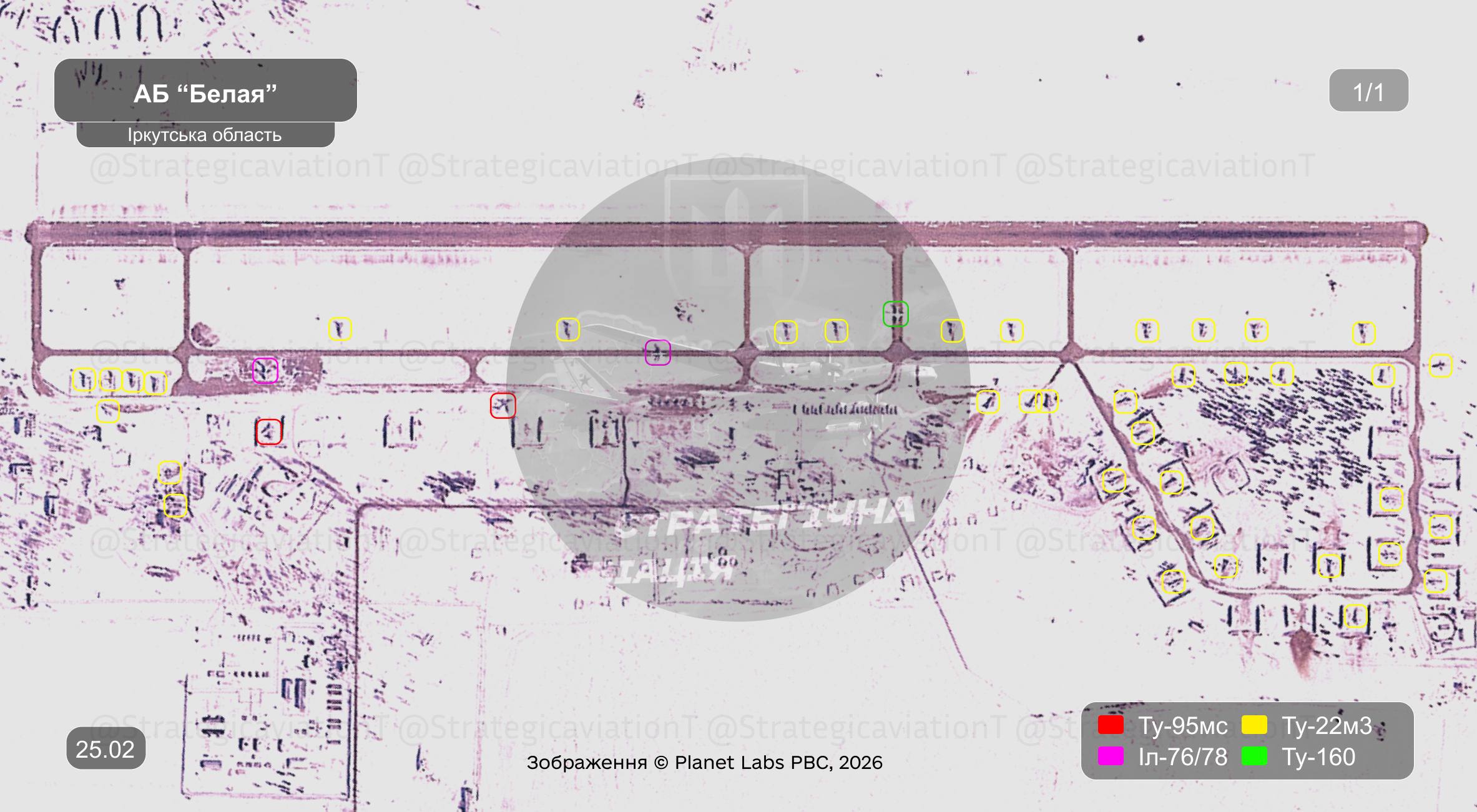 За інформацією з супутникових знімків високої якості аеродрому «Бєлая» (Іркутська область, рф) станом на 25.02 (06:35) на аеродромі були: 1 - Ту-160; 2 - Ту-95МС; 39 - Ту-22М3; 2 - Ил-76/78.