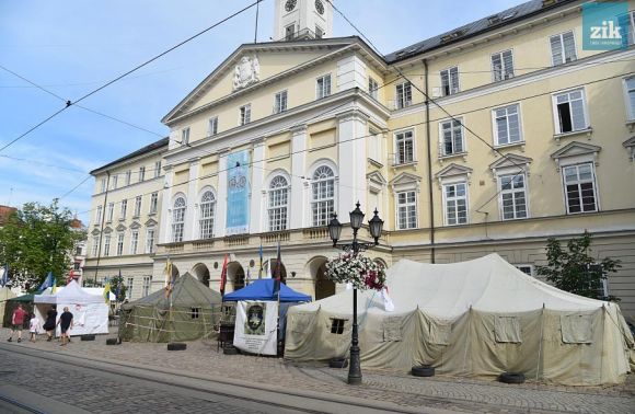«Представники громадських організацій «Розвиток громади», «Українська спілка учасників АТО», «Рабів до раю не впускають», ВПВ «Патріот», Нацкорпус Львівщини встановили наметове містечко на Площі Ринок. За словами голови ГО «Рабів до раю не пускають» Івана Спринського, метою акції є також встановлення причини зникнення коштів комунальних підприємств, відсутності аудиту, виділення коштів російським олігархам, зокрема, Чуркіну та відставка Андрія Садового», – повідомили також на порталі оперативних новин.
