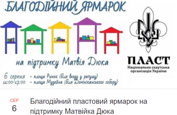 У неділю, 6 серпня, з 11.00 до 17.00 біля входу в Ратушу на площі Ринок і біля входу до Домініканського собору на площі Музейній у Львові триватиме благодійний пластовий ярмарок, на якому збиратимуть кошти на лікування важкохворого Матвійка Дюка зі села Нагірного.