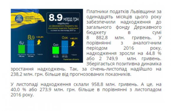 Про це повідомили у Львівському обласному управлінні Державної фіскальної служби України, де також запевнили: «Зберігається позитивна динаміка зростання надходжень. Так, за січень-листопад надійшло на 238,2 млн. гривень більше від прогнозованих показників. У листопаді надходження склали 958,8 млн. гривень. А це, на 40% або 273,9 млн. гривень більше в порівнянні з листопадом 2016 року».