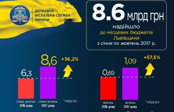 У Львівському обласному управлінні Державної фіскальної служба України повідомили також сьогодні, 7 листопада: «У жовтні надходження склали один мільярд 92,1 млн. гривень. Зокрема, в порівнянні з січнем-жовтнем 2016 року, місцеві бюджети області отримали на два мільярди 270,7 гривень або на 36,2 % більше податків, зборів та інших обов’язкових платежів, що контролюються органами державної фіскальної служби. В порівнянні з жовтнем 2016 року надходження зросли на 398,6 млн. гривень або на 57,5 % більше».