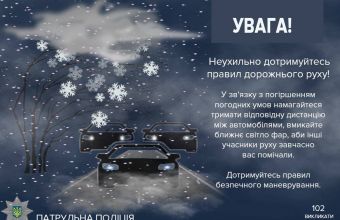 У Львівському обласному управлінні поліції повідомили сьогодні, 20 грудня: «До уваги водіїв! Складні погодні умови вимагають підвищеної обережності та уважності за кермом. Під час снігопадів, в умовах поганої видимості навіть у світлу пору доби, а також на слизькому дорожньому покритті, закликаємо вас відповідально ставитись до керування транспортними засобами. Ні за яких умов не перевищуйте швидкість руху, акуратно маневруйте та завчасно вмикайте сигнали повороту при зміні напрямку руху».
